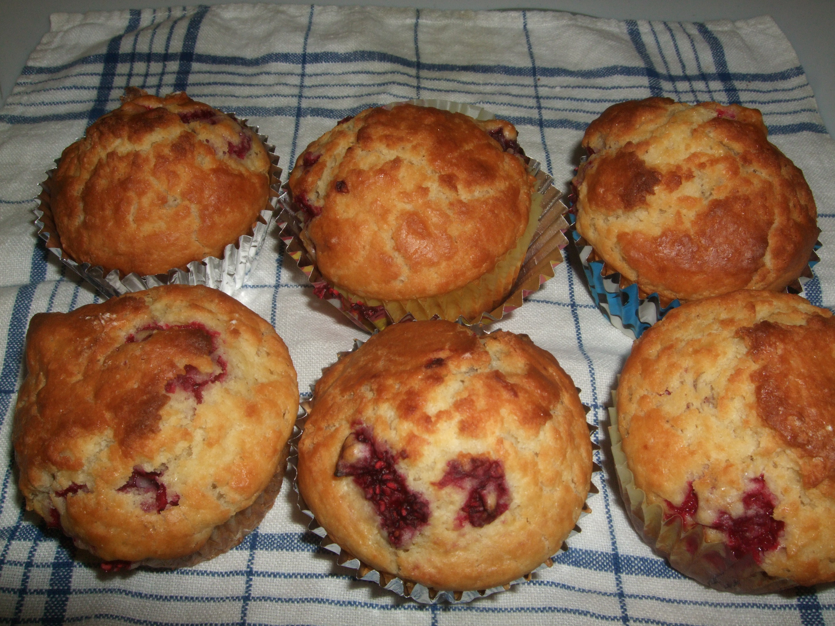 Combine the liquid ingredients with the dry with a few quick stroke. Before dry ingredients are all moistened, fold 1 cup of raspberries gently into the mixture. The secret to light muffins is to not over stir. Fill muffin papers to the brim and bake 20-25 minutes at 400 degrees. Makes 10-12.