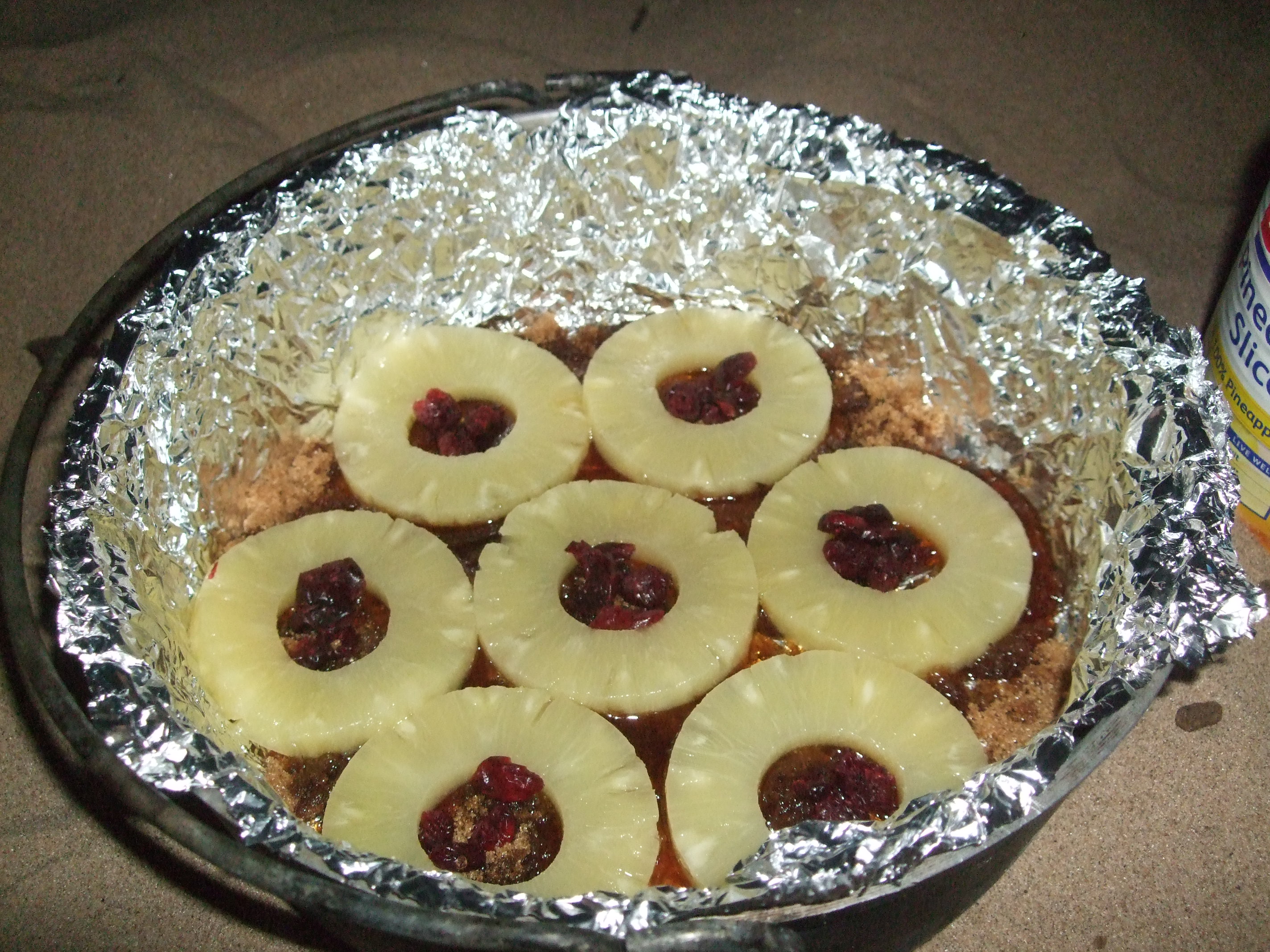 6) Spread brown sugar in the bottom of Dutch Oven. Arrange pineapple slices on top of sugar, putting cherries/craisins in pineapple centers. I used one layer, but next time I will use all slices in the can.
