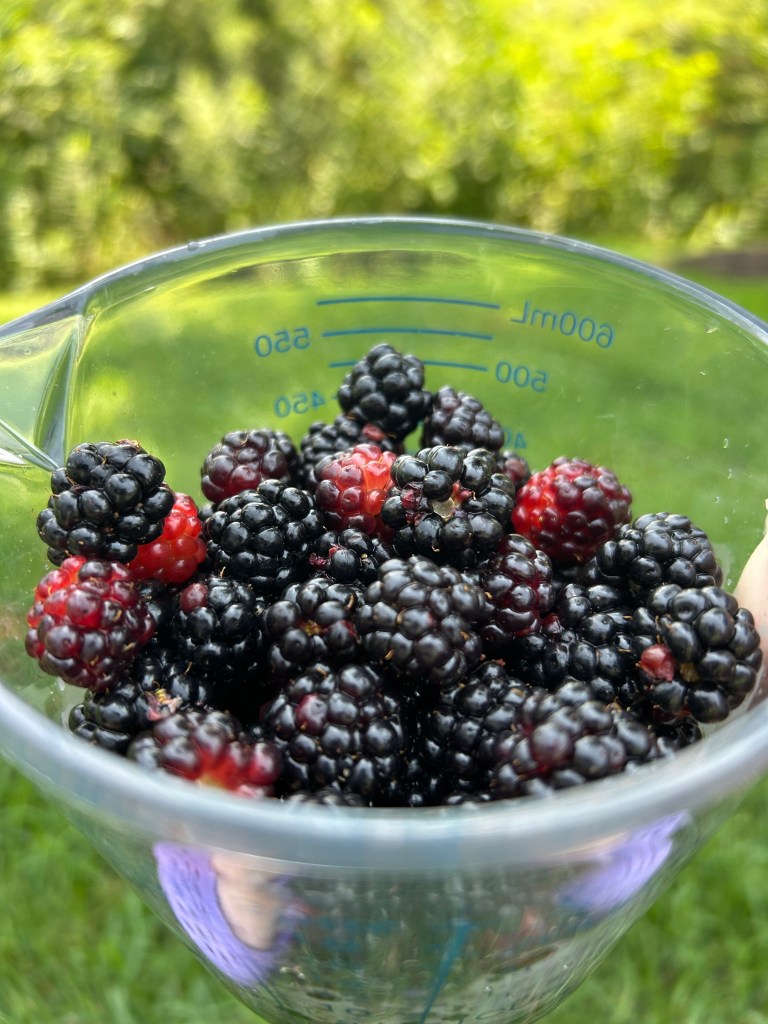 My research into how peasants and habitants supplement their diets by foraging made me want to try it myself. Right in my backyard—in the wild marshy area—I discovered blackberries. I picked as many ripe berries as I could reach without getting trapped in brambles. I have the scratches to prove it and will don long pants for tomorrow’s picking. Other than muffins, what can I make with blackberries?? Recipes anyone?