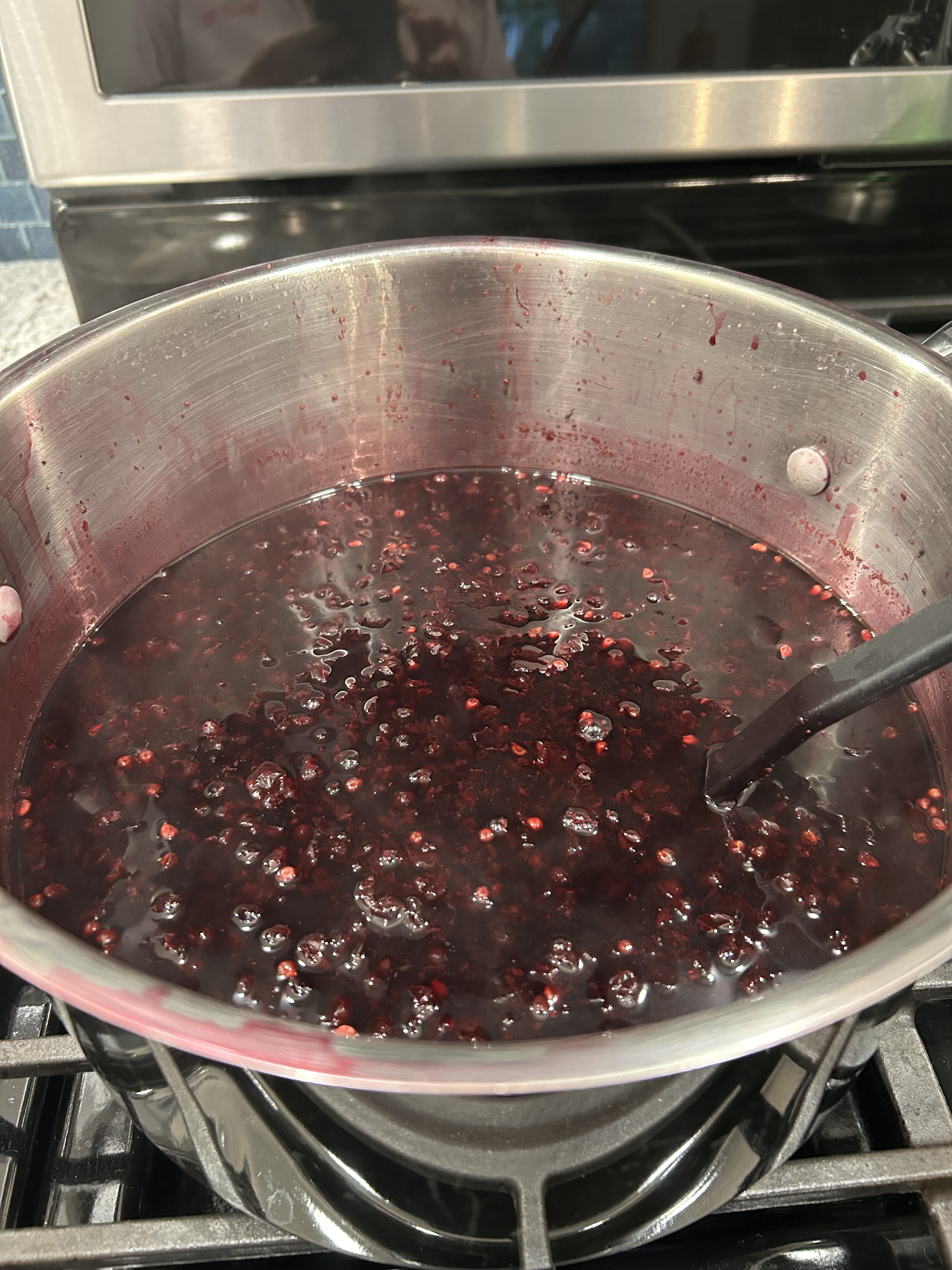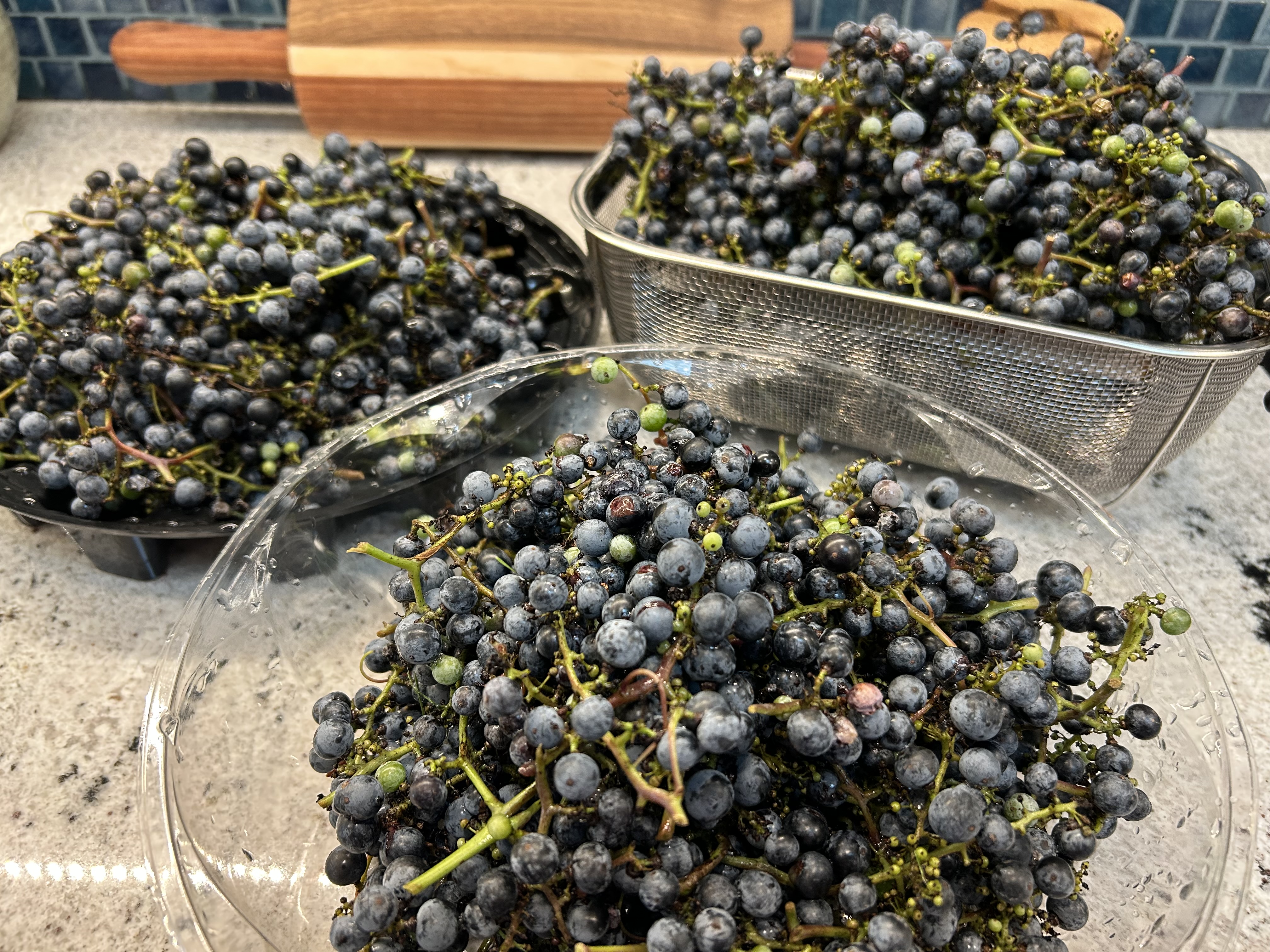 I spent an hour harvesting the grapes and another two hours de-stemming them, my fingers hurt as if I’ve been quilting all day without a thimble. With sticky, purple fingers, I mashed and cooked six pound of grapes into beautiful dark juice. Gorgeous.