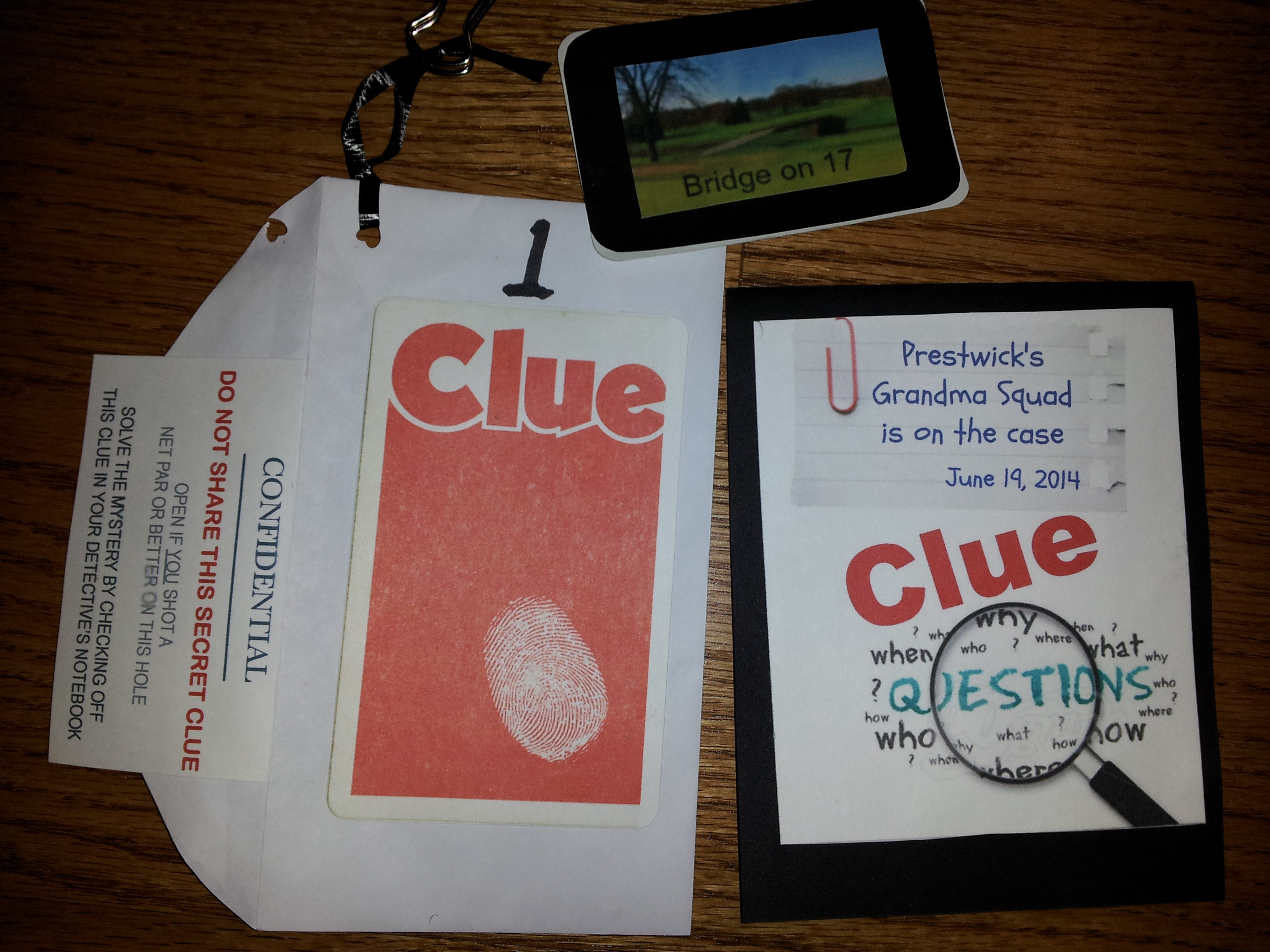 On the golf course, clip a Clue envelope to each pin pole/flag. Tie them on or use heavy clamp paper clips. Use a sturdy envelope in case of dampness. I used heavy 6×9.