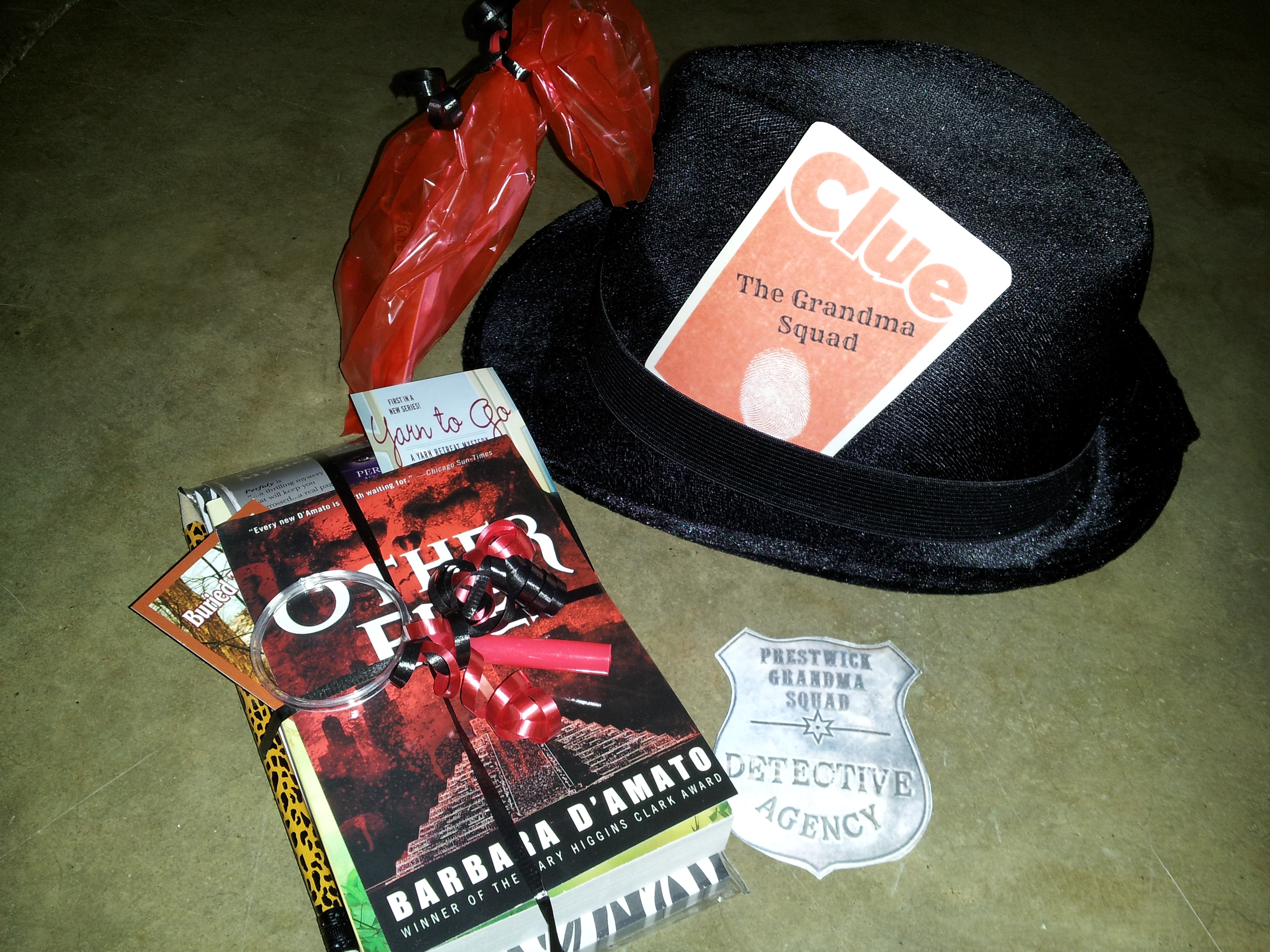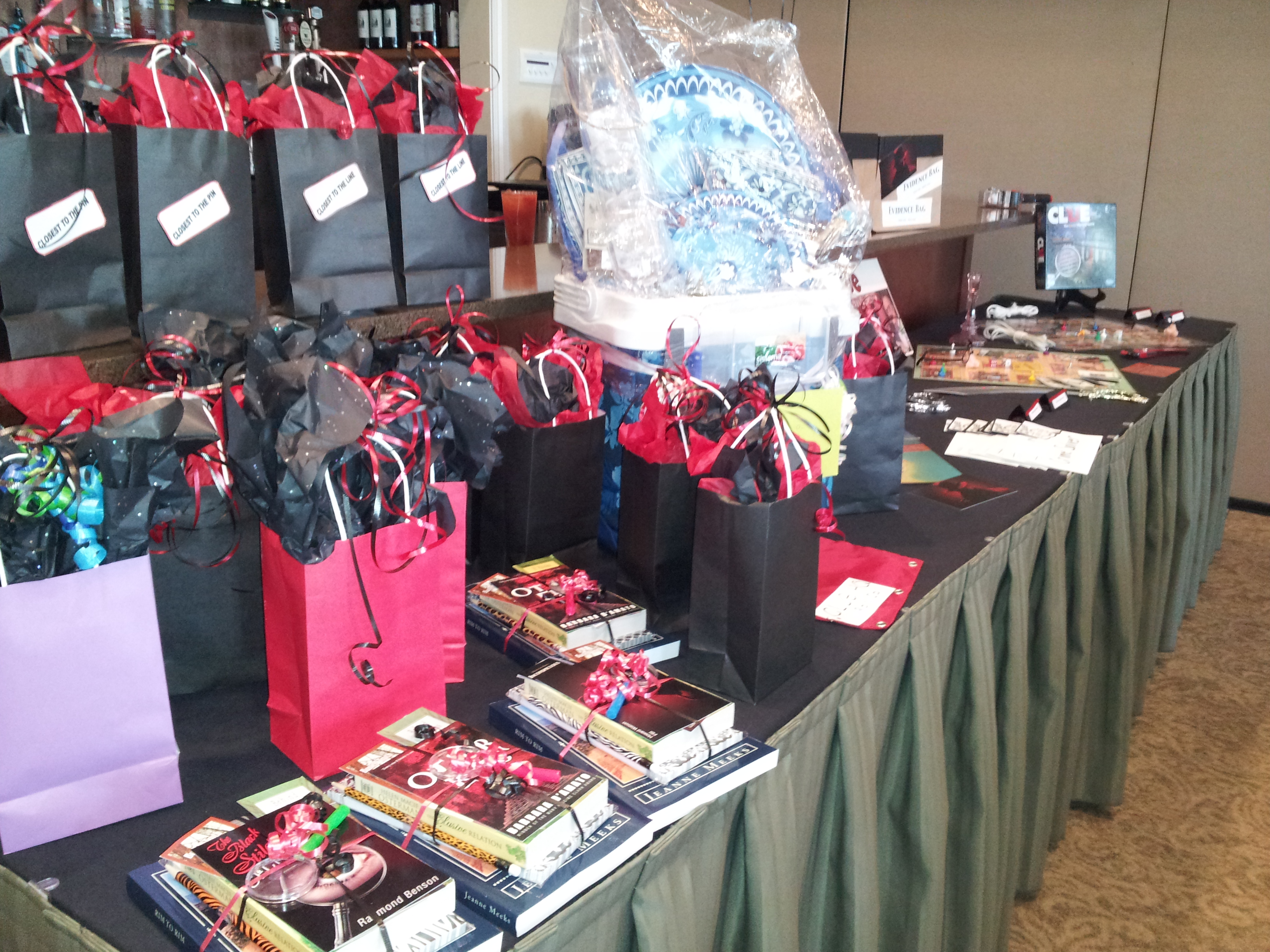 Similar to birthday bags … Evidence Bags (brown paper bags marked “evidence”, tied with red ribbon). Either to hold table favors or to hold door prizes.
