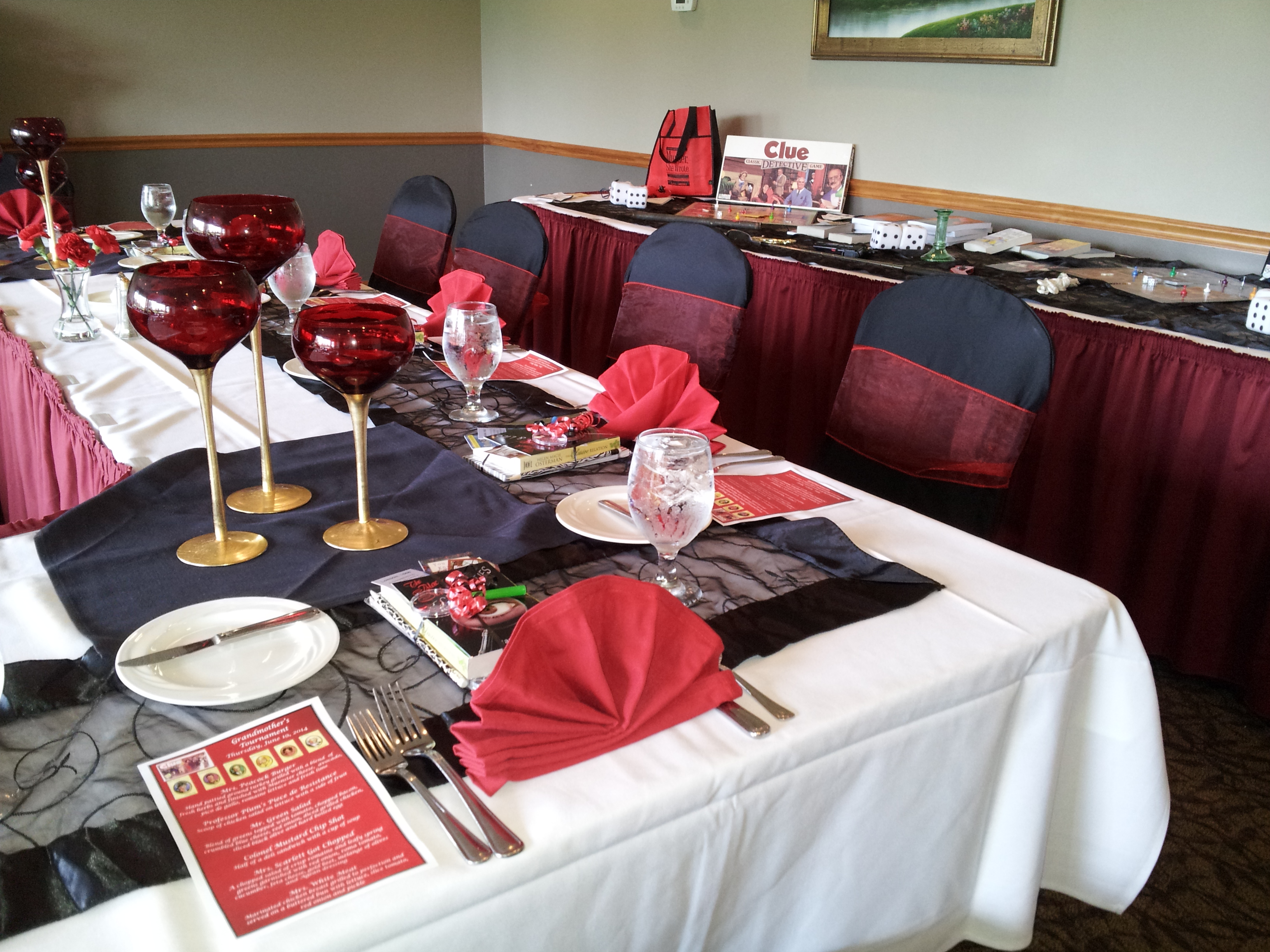 For centerpieces, we took a photo of a Clue game board and brought it to an office supply place which had a large blueprint printer and made copies the same size as a real game board. The store may also be able to copy directly from a board. The copies were then laminated. A bit pricey, but worth it.