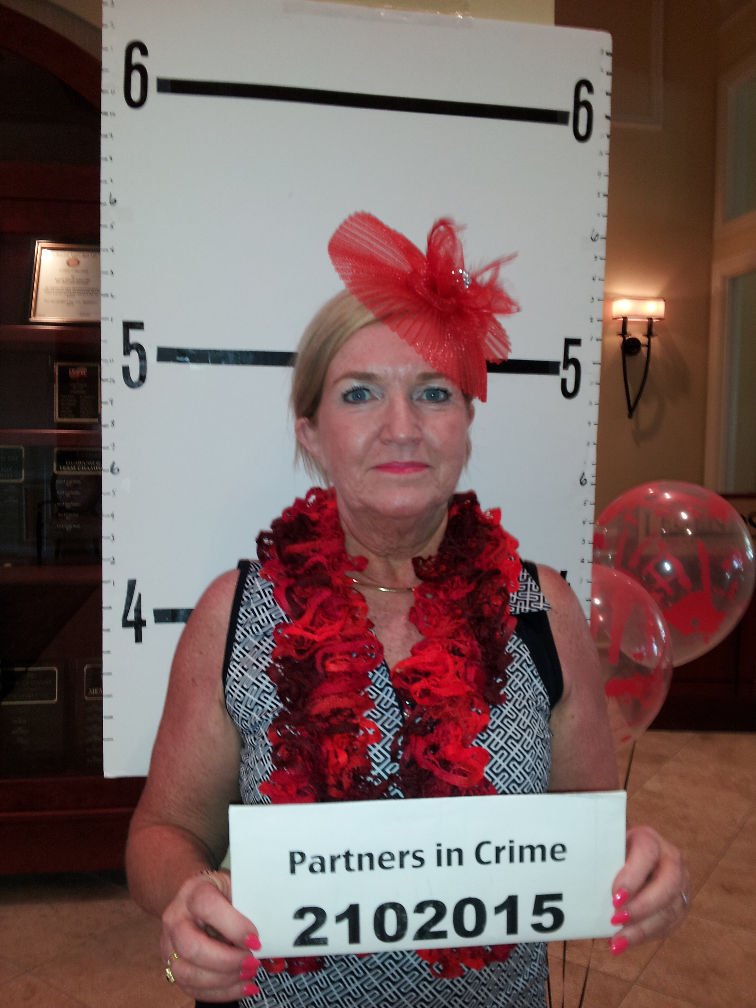 Make a Prisoner Line Up background on foam poster board (with heights indicated) for mug shots to be taken with a prisoner’s number card. Take pictures outside before golf, and after golf as players enter dining room.