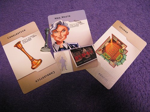 From your groups of suspects, weapons, and locations, draw one card from each category. Put those three cards into a sealed envelope. These are the answers to the mystery. Keep them secret.